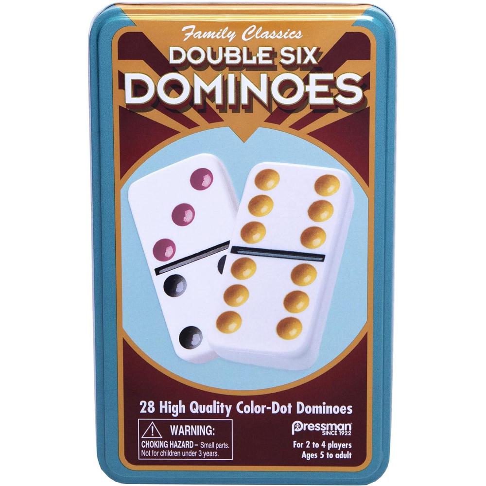 This classic double six color dot dominoes from Pressman toys is perfect for the avid domino player. The high-quality dominoes are finished with dots in rich, bold colors. All dominoes fit snugly in this vintage style tin box for easy, stylish storage. For 2-4 players, ages 5 and up.